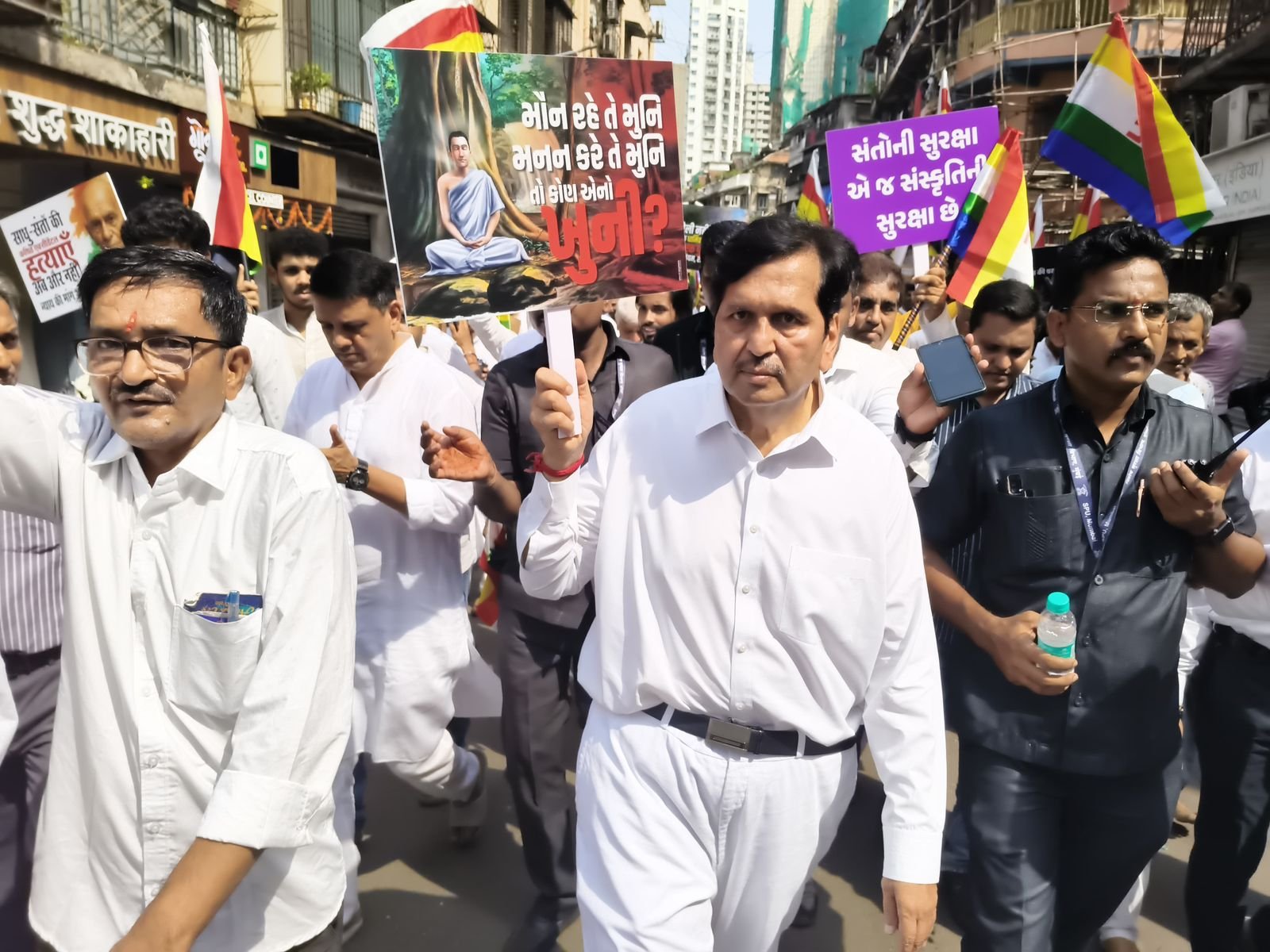राजस्थान मे जैन संतों की दुर्घटनाओं के विरोध में मुंबई में आज जैन समाज सड़को पर उतरा मुंबई मे आज आक्रोश रैली आयोजित की गयी इस महरैली मे बड़ी संख्या मे भाई बहमों ने भाग लिया दक्षिण मुंबई के vp रोड से रैली शुरू होकर कालबादेवी के गोड़ीजी जैन मंदिर मे रैली पहुंचकर धर्मशाभा मे परिवर्तित हुई, रैली मे लोग हाथों मे तख्तीया लिये हुए थे जिन पर नारे लिखें हुए थे साथ ही लोग रैली मे सड़को पर भी नारे लगा रहे थे,, रैली मे कई बड़े जैन आचार्य भगवान्त के साथ बड़ी संख्या मे साधु साध्वी जी भी थे, गोड़ी जी मे धर्म सभा मे वक्ताओ ने आक्रोषित स्वर मे कहा कि जैन समाज ने दुर्घटनाओ मे बहुत संत खोये हैँ इसमें जो पैटर्न मे घटना हो रही हैँ वो साजिश लगती हैँ उन्होंने सरकार को एक मांग पत्र दिया जिसको मुंबई कलेक्टर ने सभा मे आकर स्वीकार किया कलेक्टर ने आश्वासन दिया कि वह आपकी बात आगे उठाएंगे, मंत्री मंगल प्रभात लोढ़ा ने महा रैली मे राज्यपाल से फोन पर बात की और राज्यपाल ने कहा कि हम भविष्य में ऐसी घटना ना हो ऐसा पूर्ण प्रयास करेंगे सभा मे आचार्य अक्षय चंद्र सागर सूरी जी आचार्य राज परम सूरी जी आचार्य नयपदम सागर सुरिजी, मुनिराज विनम्र सागर जी, राज सुन्दर विजयजी,राज धर्म विजय जी धनंजय विजयजी सहित कई गुरु भगवान को ने अपनी बात रखी मंगल प्रभात लोढ़ा और शासन सैनिक परिवार के मुकेश वर्धन ने भी सभा मे अपना उद्बोधन दिया यह रैली मुंबई जैन संघ sangjthan और शासन सैनिक परिवार के संयुक्त तत्त्वधान मे आयोजित की गयी थी, इस आयोजन मे मुख्य प्रेरणा आचार्य भगवान्त राज परम सुरिजी मंत्री मंगल प्रभात लोढ़ा अतुल शाह और मुकेश वर्धन की रही, आज की रैली मे जैन समाज के गणमान्य नागरिकों में भाग लिया इसमें प्रमुख मंत्री मंगल प्रभात लोढ़ा वीरेंद्र भाई, अतुल शाह,जीतेन्द्र शाह – फाम अध्यक्ष , मुकेश वर्धन, नितिन शाह महेंद्र अंगारा दिनेश बोथरा चेतन जावेरी मुकेश जैम, रिखाब मेहता धर्मेंद्र जैन आदि प्रमुख थे