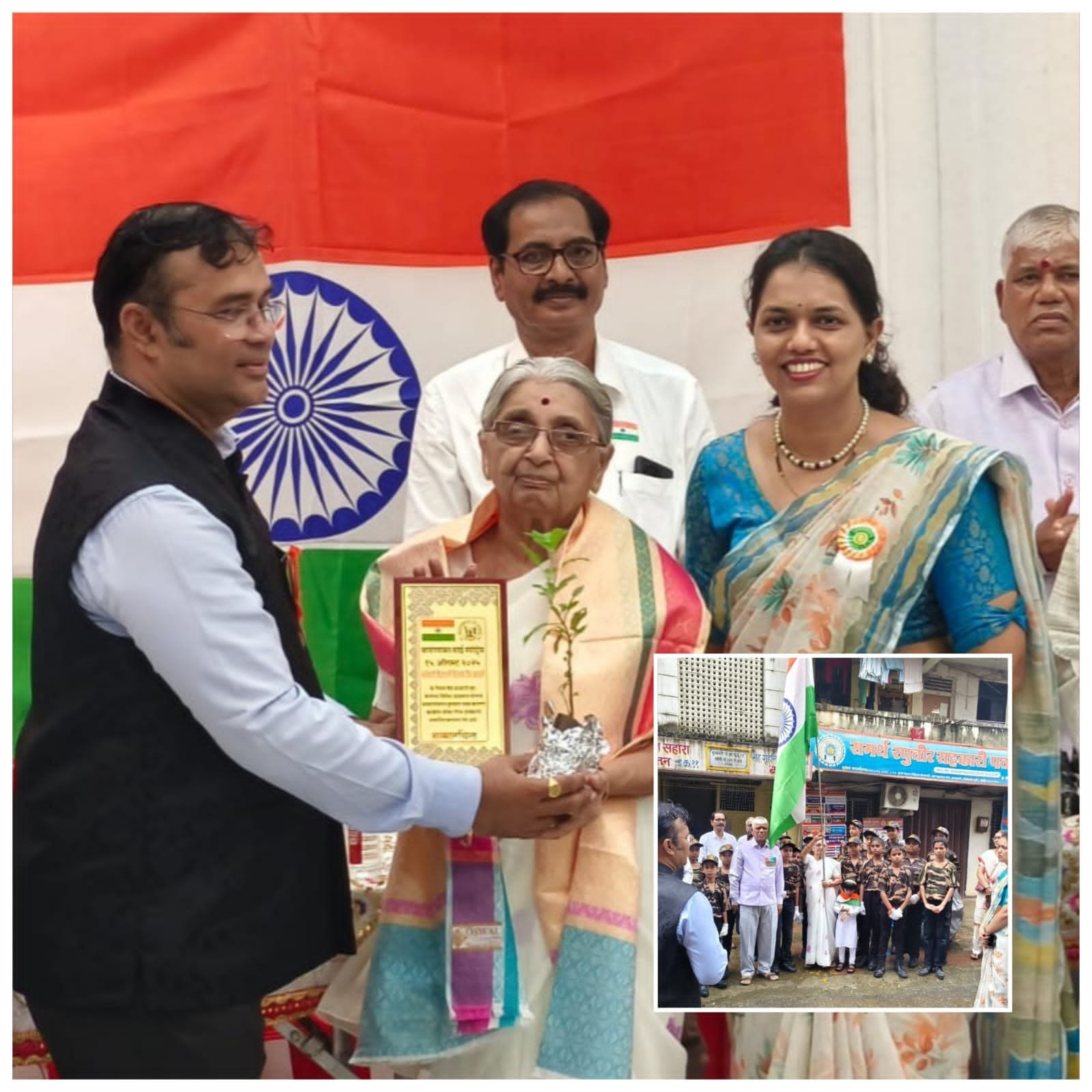 मुंबई, दि. (प्रतिनिधी) : बोरीवली पूर्व येथील जय महाराष्ट्र नगर वसंत व्याख्यानमाला चे अध्वर्यू ज्येष्ठ राजकीय विश्लेषक विजय वैद्य यांच्या पत्नी श्रीमती वैशाली विजय वैद्य यांच्या उल्लेखनीय कार्याबद्दल त्यांना वायंगणकर साई स्पोर्ट्स क्लबने जीवनगौरव पुरस्कार देऊन गौरविण्यात आले. त्याचबरोबर भारतीय लष्करात उल्लेखनीय कामगिरी बजावणाऱ्या जवानांनाही सन्मानित करण्यात आले. जय महाराष्ट्र नगर बोरीवली पूर्व येथील साई मंदिर सभागृहात भारताच्या ७९ व्या स्वातंत्र्य दिनाच्या कार्यक्रमात श्रीमती वैशाली विजय वैद्य यांना जीवनगौरव पुरस्कार देऊन सन्मानित करण्यात आले. शाल, सन्मानचिन्ह, तुळशीचेरोप असे पुरस्काराचे स्वरूप होते. वैशाली विजय वैद्य यांच्या बरोबरच एन एस जी कमांडो संताजी (सनी) अनंत शिगवण, प्रशांत चांदगुडे, अरविंद गव्हाणकर, ओंकार शिवाजी क्षीरसागर, संकल्प करिअर अकॅडमीचे ज्ञानेश्वर कराड, संदीप कराड, निर्भया पथकाच्या सौ. शुभदा साळसकर यांनाही सन्मानचिन्ह, शाल, तुळशीचे रोप देऊन सन्मानित करण्यात आले. या कार्यक्रमापूर्वी भारतीय लष्करी जवानांचा वेष परिधान करून शाळकरी मुली मुले यांचे जय महाराष्ट्र नगर परिसरात संचलन करण्यात आले. वैशाली विजय वैद्य यांनी इमारत क्रमांक अकरा जवळ संचलनाची मानवंदना स्वीकारली आणि भारताचा भला मोठा राष्ट्रध्वज उंचावून अभिवादन केले. वायंगणकर साई स्पोर्ट्स क्लबचे प्रमुख राकेश वायंगणकर, पल्लवी वायंगणकर, हर्षिता वायंगणकर यांच्या अधिपत्याखाली झालेल्या या कार्यक्रमास सनी शिगवण यांचे वडिल अनंत शिगवण, विजय घरटकर, जयवंत राऊत, माजी नगरसेवक गीता सिंघण, विजय सिंघण आदी मान्यवर उपस्थित होते. सैनिकी गणवेशातील विद्यार्थी विद्यार्थीनी यांना प्रशस्तीपत्रे देऊन त्यांनाही प्रोत्साहित करण्यात आले.*
